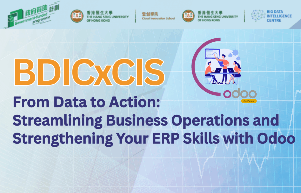 Events Exhibition – AI: Empowering Minds, Enriching Lives 15 Nov 2025 Digital Finance Frontiers: From Innovation to Implementation 14 Nov 2025 Streamline Business Operations & Strengthen ERP Skills with Odoo 06 Nov 2025 Data Analytics and Machine Learning over Cloud Platform 14 Mar 2025 FUTURE EDGE OF LOGISTICS IN THE DIGITAL ERA 13 Mar 2025 FUBON BANK (HK) x AWS x HSUHK CIS DATA HACKATHON 2024 15 Nov 2024 CYBERSECURITY FINTECH REGULATIONS IN THE ERA OF CLOUD COMPUTING 01 Nov 2024 ERP Workshop with Online Gamified Simulation 18 Oct 2024 Seminar on Digital Transformation by AI and Cloud 29 May 2024 Page1 Page2